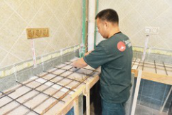 注意事项:钢筋绑扎前,在模板上反铺一层瓷砖,浇筑混凝土后瓷砖即为台面的底部装饰层,既节约了施工成本,又便于橱柜内日后的清洁。