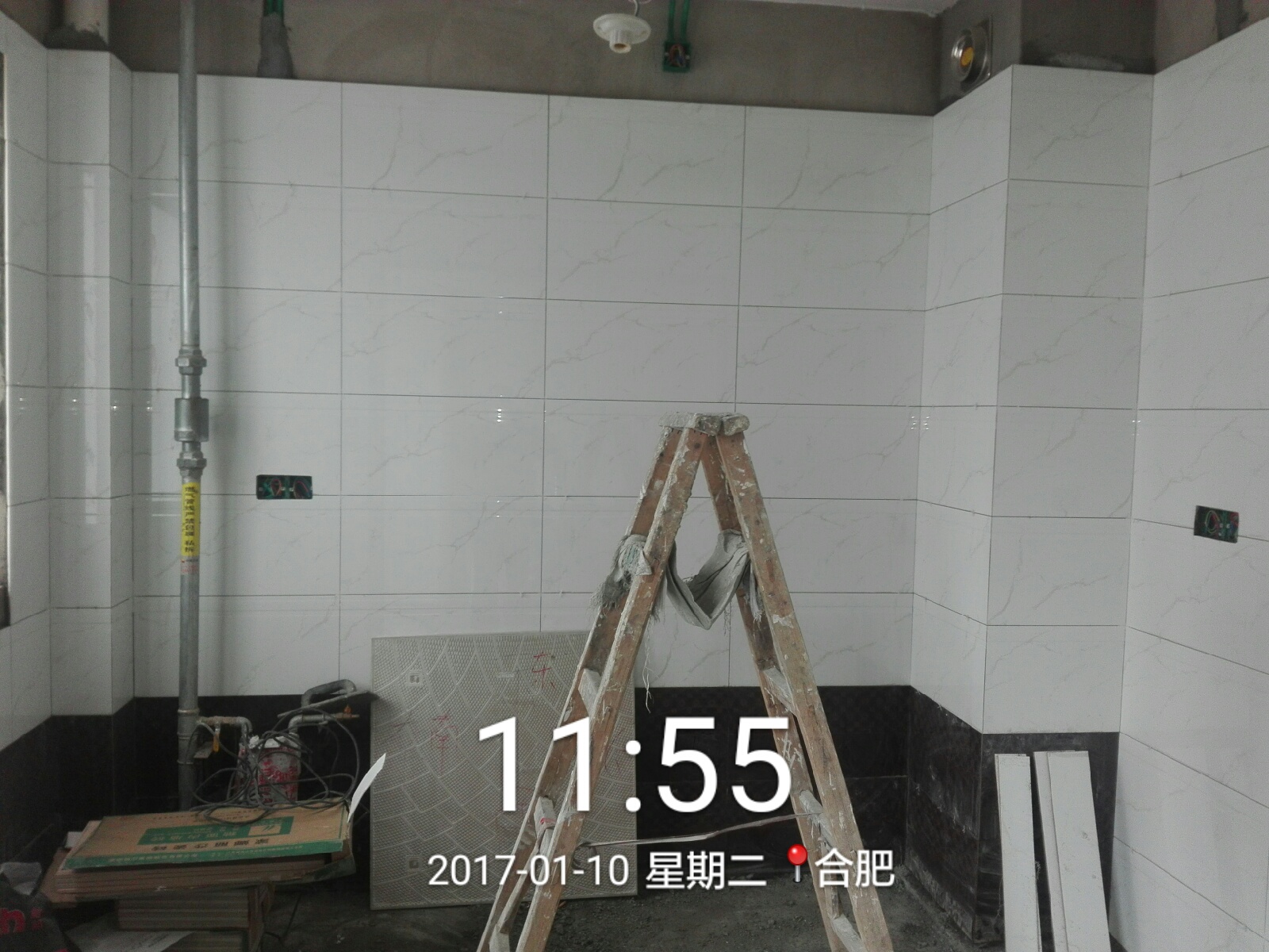 瓦工施工遵循今朝贴砖施工工艺,阴阳角处理非常平直,各个处理都恰到好处!厨房墙砖也铺贴完毕。