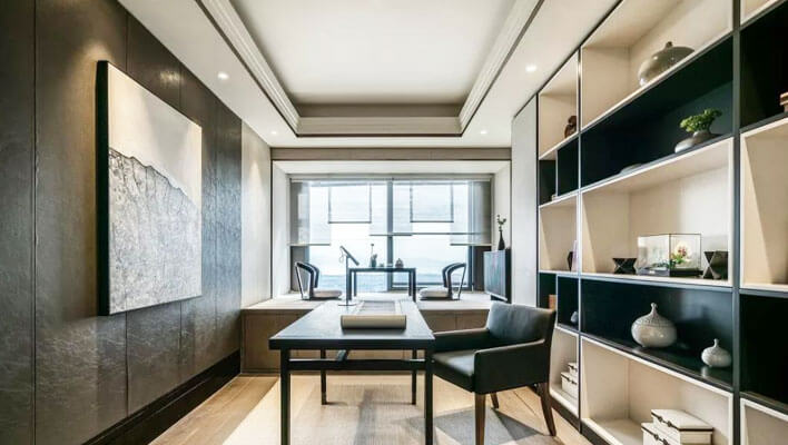 本案为新中式风格,将中式元素与现代时尚巧妙糅合,正是目前社会都市精英阶层所追求的雅致生活,中式素雅,气质之美。一切以功能出发,注重空间收纳和人文情怀。以木质隔断营造出了客厅空间的通透氛围,以中式的韵去融合客厅的味,背的山水硬包更使得整个客厅灵动有神,东方之美。